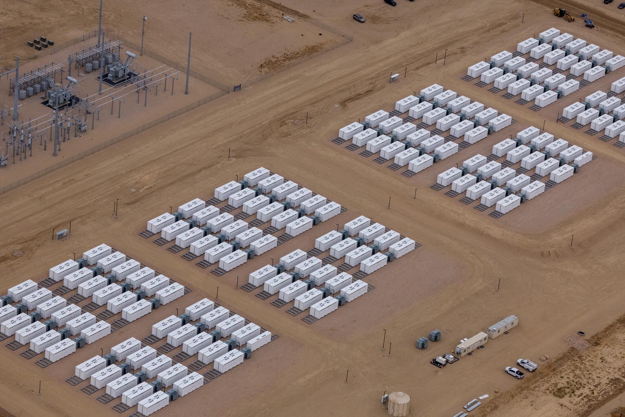 وحدات تخزين البطاريات في مركز إيلاند للطاقة الشمسية والتخزين في صحراء موهافي بمقاطعة كيرن في 25 نوفمبر 2024.