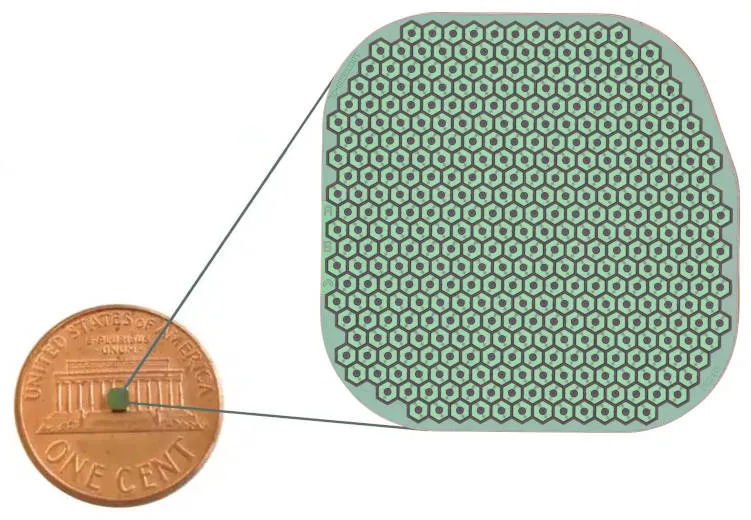 تبلغ أبعادها 2 × 2 مم وسمكها 30 ميكرومتر، وتحتوي على 378 بكسل سداسية متقاربة يبلغ عرض كل منها 100 ميكرومتر، ويتم إدخالها جزئيًا عبر شبكية العين، تحت القضبان والأقماع التالفة، أعلى الخلايا “ثنائية القطب” غير التالفة والحساسة كهربائيًا.