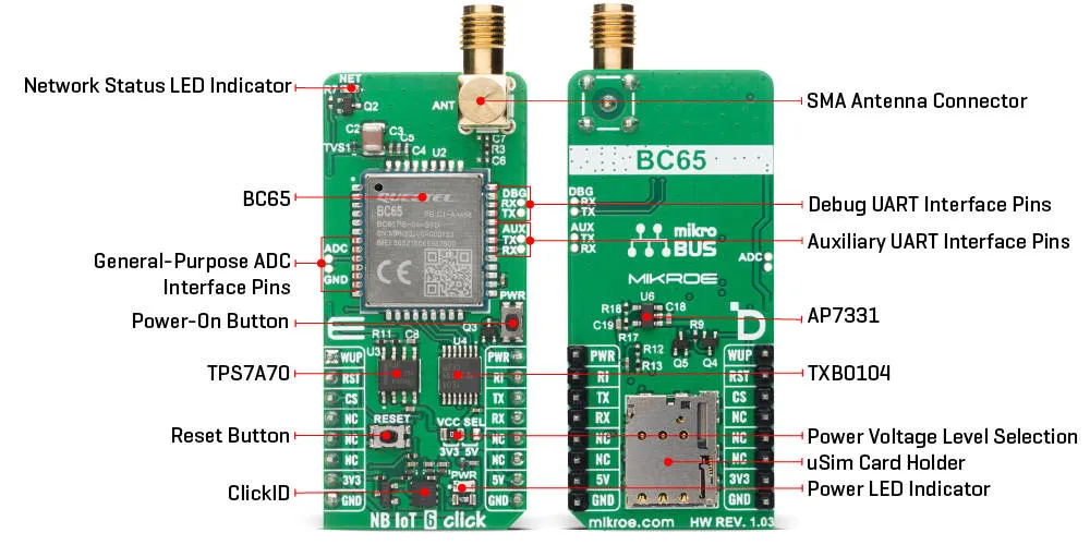 يُطلق عليه اسم “NB IoT 6 Click”، ووحدته اللاسلكية النشطة هي BC65 من شركة Quectel ومقرها شنغهاي، وهو جهاز منخفض الطاقة (4μA) متوافق مع الإصدار 13 والإصدار 14 من 3GPP، ويدعم نطاقات LTE B1 وB3 وB5 وB8 وB20 وB28 عبر 700 ميجا هرتز إلى 2.2 جيجا هرتز.