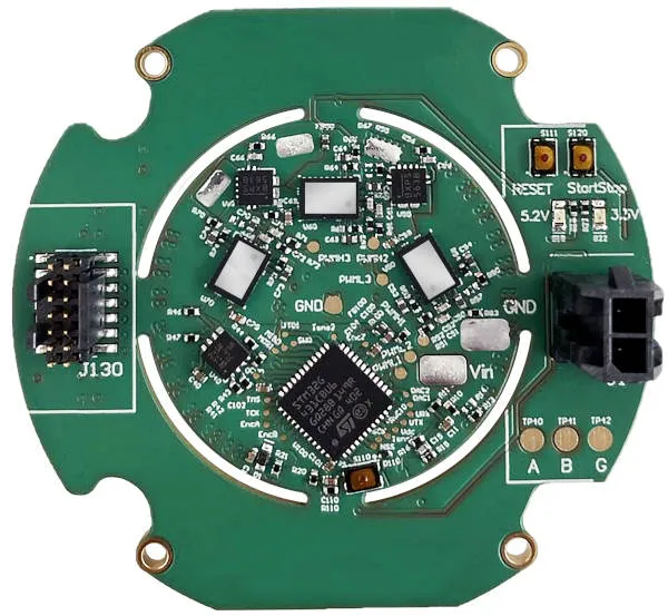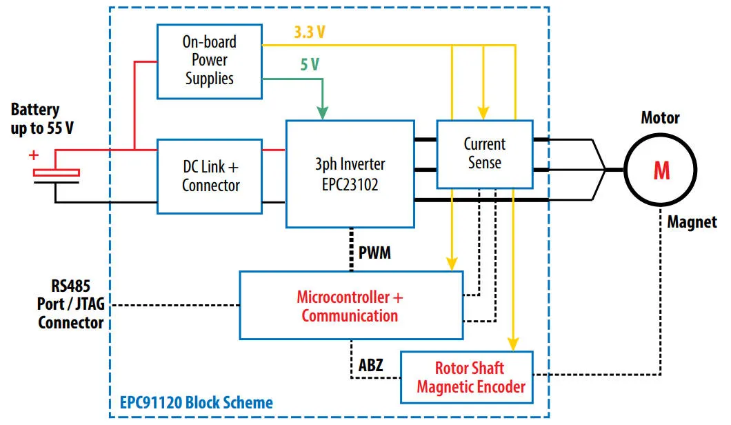 يحتوي على ثلاث وحدات متكاملة من GaN نصف جسر EPC23102، ووحدة تحكم دقيقة STM32G431CBU6 على اللوحة، واستشعار التيار، واستشعار الجهد، وواجهة تشفير مغناطيسي واتصال RS485.