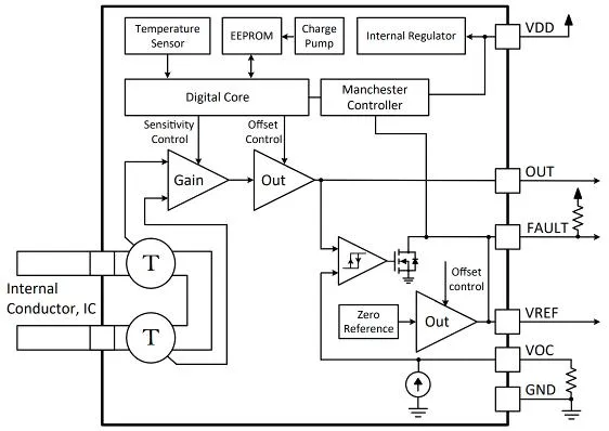 يحتوي المستشعر على مسار تيار داخلي معزول 1.2mΩ، ويأتي في نسختين: ±25A أو ±50A.