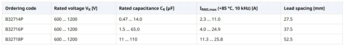 يمكنك العثور على مزيد من المعلومات حول TDK موقع إلكتروني، ولكن البيانات المتعلقة بسلسلة المكثفات السينمائية DC Link موجودة أدناه (انقر فوق الصورة للتوسيع).