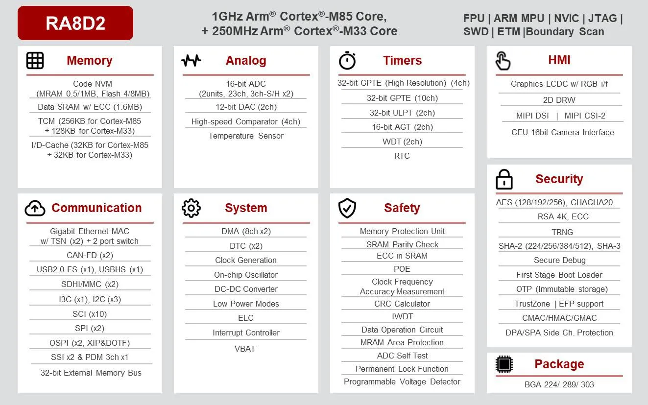 خيارات الحزمة هي 176 لوحة LQFP، و224 لوحة BGA و289 دبوس BGA لـ RA8M2، وBGSa فقط لوحدات RA8D2 MCU.
