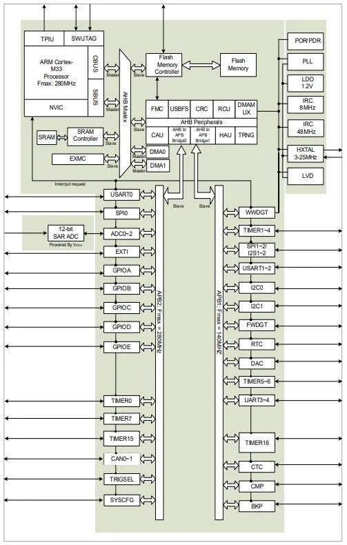 - يعمل GD32F503 بما يصل إلى 252 ميجاهرتز ويحتوي على ما يصل إلى 1 ميجابايت من الفلاش (يصل إلى 256 كيلو بايت كود فلاش) و128 كيلو بايت من ذاكرة الوصول العشوائي.