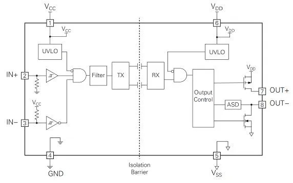 يستخدم IX3407B ، كما سيكون معروفًا ، حاجز عزل بالسعة 2.5 كيلو فولت (3KV لمدة 1) ويمكن أن يقاوم عابرة 150 كيلو فولت/μs.
