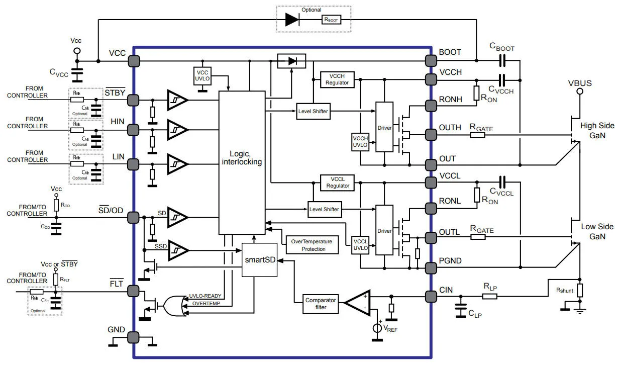 على نحو غير عادي، بدلاً من مخرجات السحب لأعلى ولأسفل للمقاومات المنفصلة لتوفير تشغيل وإيقاف GaN متحكم فيه (على التوالي) في كل قناة، فإن IC يحتوي فقط على مقاومة بوابة واحدة في كل قناة، ولكن أيضًا مقاوم تشغيل متسلسل على الجانب العلوي لسائق الإخراج (انظر الرسم البياني). نظرًا لأن هذا المخطط يمكن أن يوفر أداءً متساويًا، فقد تساءلت شركة Electronics Weekly عن سبب خرق ST للتقاليد (قبل أن تستجيب الشركة، لا تتردد في التفكير في ذلك في قسم التعليقات أدناه).